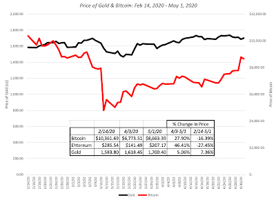At the risk of repeating what I have said in prior weeks, the drop in copper prices is consistent with an expectation of a global economic showdown but the drop in oil prices reflects something more. In fact, a comparison of Brent and West Texas crude oil prices highlights one of the more jaw-dropping occurrences during this crisis, when the price of the latter dropped below zero on April 19. The oil business deserves a deeper look and I plan to turn to that in the next few weeks. Finally, I look at gold and bitcoin prices during the crisis, with the intent of examining their performance as crisis assets: