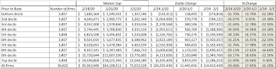 Note that it is the lowest PE stocks that have lost the most market capitalization (almost 25%) between February 14 and May 1, whereas the highest PE stocks have lost only 8.62%, and to add insult to injury, even money losing companies have done better than the lowest PE stocks. I follow up by looking at stocks broken down by price to book ratios: