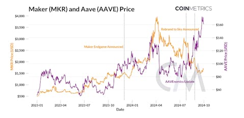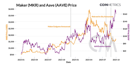 Price Comparison of Maker (MKR) and Aave (AAVE) with Key Milestones