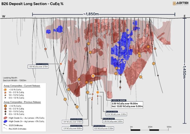 Abitibi Metals Corp. (CSE:AMQ) (OTCQB:AMQFF) (FSE: FW0) (“Abitibi” or the “Company”) is pleased to report a new high-grade copper-gold intercept from its Phase 3 drill program at the B26 Polymetallic Deposit (“B26” or the “Deposit”) in Québec, which was completed in December 2025. The Company’s resource improvement drilling campaign continues to outperform expectations, confirming exceptional grade continuity and delivering strong copper-gold intercepts in hole 269W6. These additional intercepts from hole 269W6 further underscore a robust high-grade mineralized system, reinforcing the potential for significant resource growth and potential meaningful improvements to overall project economics.