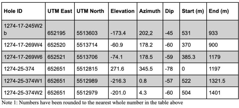 Note 1: The intercepts above are not necessarily representative of the true width of mineralization. The local interpretation indicates that the mineralized lens’ true width generally corresponds to 50% to 85% of the core length.