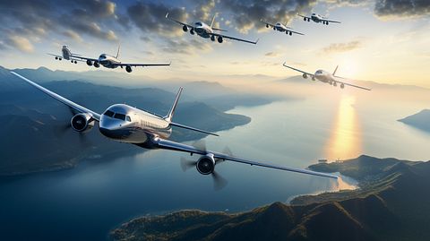 An aerial view of aircrafts flying in formation, reflecting the company’s punctuality and efficiency.