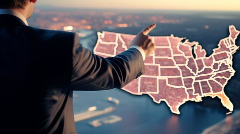 A hand pointing from the United States to the global markets represnted in a map representing potential investment opportunities for U.S. investors.