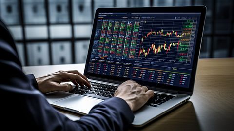 A portfolio manager holding a laptop and looking over a stock market ticker.