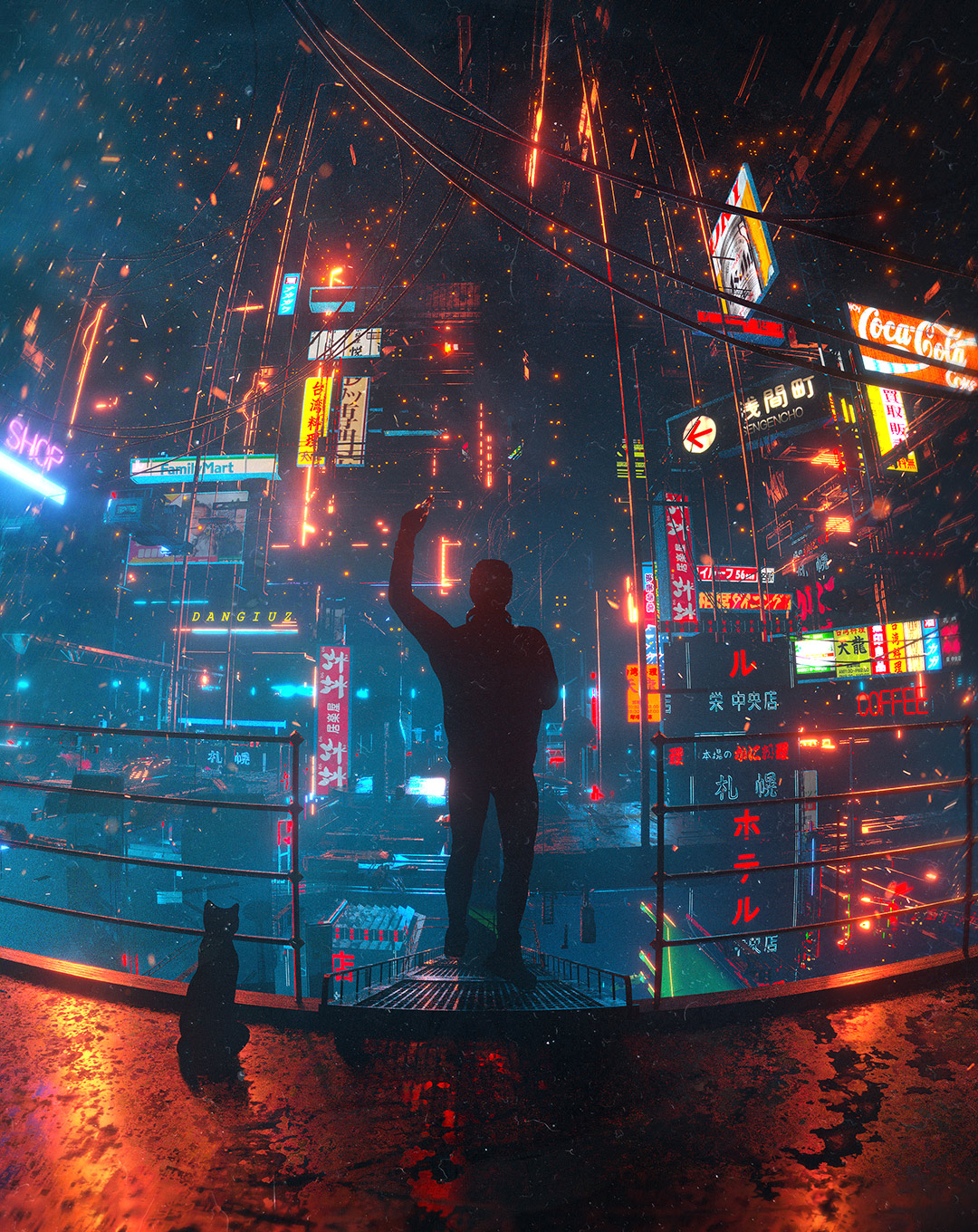 A: My work is heavily influenced by movies such as Blade Runner, Altered Carbon, and Ghost in the Shell. I work in the same sci-fi and cyberpunk category. My vision is one of a world where technology pretty much governs everything and all human life as we know it has been transformed completely, not necessarily for the better.
