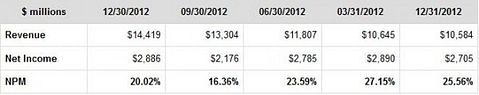 Even if the annual trend is seen, revenue has grown from $42.9 billion in 2009 to $156.5 billion in 2012 (265% growth). Net income has grown 407% during the same period, from $8.23 billion to $41.73 billion. The net profit margin has, consequently, increased from 19% in 2009 to 27% in 2012.