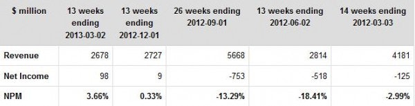 In 2011-12, the revenue was $18.42 billion, indicating that the revenue declined nearly 40% in 2012-13. It had a net income of $2.45 billion in 2009-10 but reported a net loss of $646 million in 2012-13. The quarterly trends indicate that while revenue has declined significantly YoY, the margins have started to turn positive over the last two quarters (Table III).