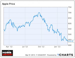 If Apple Inc. (NASDAQ:AAPL) investors thought they had already seen shares hit rock bottom at $435 shortly after last quarter’s earnings release, they were wrong. As the sequester technically begins today and the market opened lower, Apple Inc. (NASDAQ:AAPL) gapped down and was significantly lagging the market with losses of 2%, tapping a fresh 52-week low below $432 first thing in the morning.