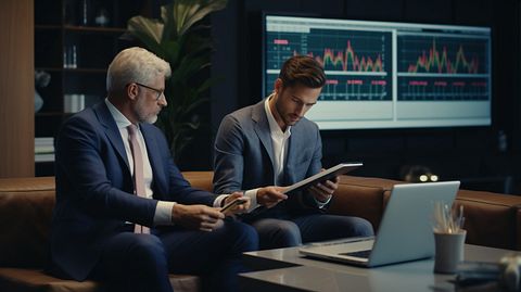 A financial advisor in a modern office, discussing mutual fund investments with a client.