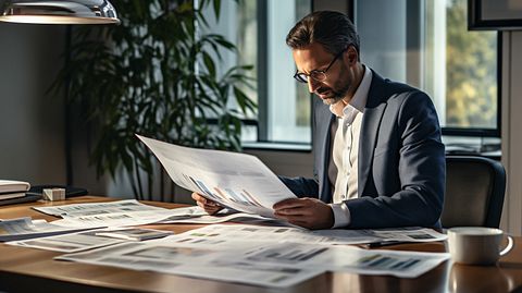 A businessperson examining financial graphs and charts of the company’s portfolio, while surrounded by residential mortgage loan documents.