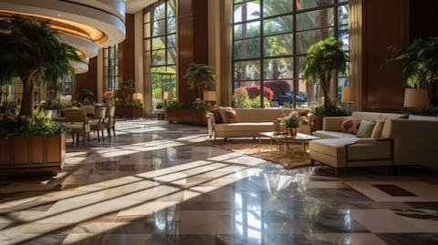 A wide angled view of an upscale lobby of a luxury hotel, capturing the warm hospitality offered to guests.