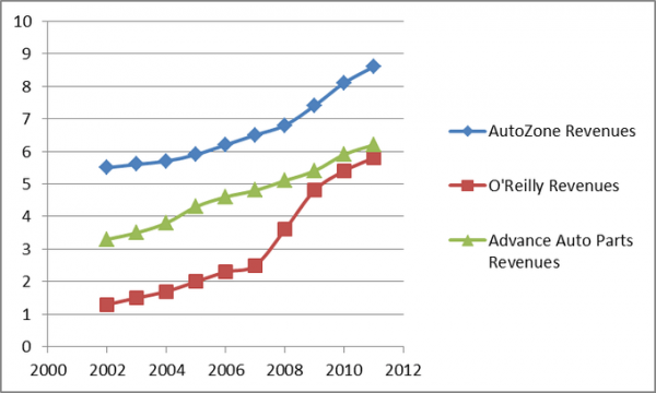 Its two closest direct competitors are O’Reilly Automotive Inc (NASDAQ:ORLY) which operates 3,740 stores in 39 states, and Advance Auto Parts, Inc. (NYSE:AAP) with its 3,600 stores in 39 states. Although I don’t think either of these are a huge threat to AutoZone, they are worth monitoring in terms of valuation, for comparison purposes. While all three of the companies mentioned are growing, with O’Reilly actually growing the fastest (see below), I think this has more to do with a general uptrend in the industry and O’Reilly capitalizing on underserved markets than it has to do with either company taking AutoZone’s market share. Advance Auto Parts’ strategy seems to be oriented more towards running its current operations as efficiently as possible and less towards aggressively increasing the number of stores. However, when looking at the revenue growths in the chart below, bear in mind that as an investment you have to consider a stock’s valuation relative to its growth rate. More on that later…