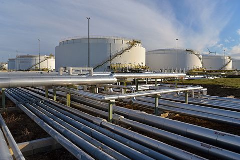 pipeline,storage tanks and buildings of a refinery – industrial plant for fuel production