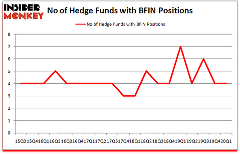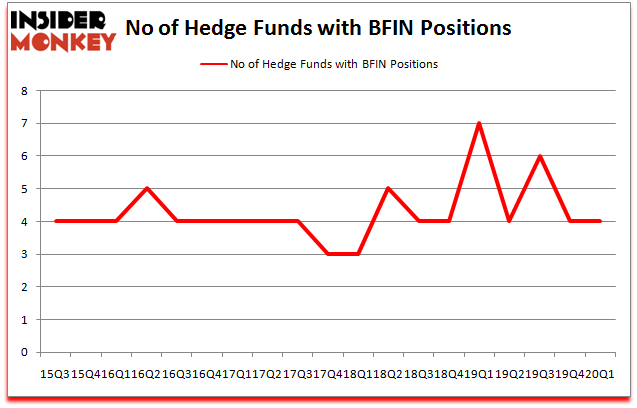 At Q1’s end, a total of 4 of the hedge funds tracked by Insider Monkey held long positions in this stock, a change of 0% from the previous quarter. Below, you can check out the change in hedge fund sentiment towards BFIN over the last 18 quarters. With hedgies’ capital changing hands, there exists an “upper tier” of notable hedge fund managers who were boosting their holdings substantially (or already accumulated large positions).