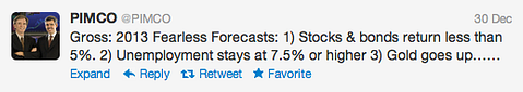 It also must be said that while general equity indices have returned a bit more than Gross foresaw at the start of 2012, his Total Return Fund is still up over 10% year-to-date, albeit at three-year average beta of 0.74 (according to Morningstar).