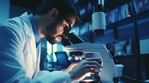 A scientist in a laboratory performing a clinical trial with a microscope to study a cancer cell.