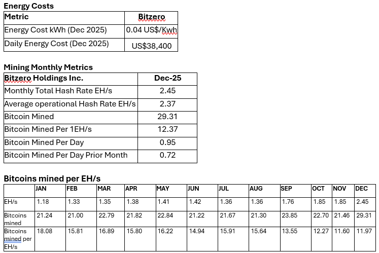 As previously announced, Bitzero remains on track to enter the next phase of expansion which is expected to deliver a total of approximately 110 MW of energized capacity by Q4 2026. Based on current forecasts, this level of capacity could support ~10.0 EH/s if fully allocated to Bitcoin mining. A further potential expansion phase is planned for completion by Q4 2027 and would increase total energized capacity to approximately 325 MW if completed as contemplated. A fully dedicated 325 MW of capacity to Bitcoin mining could support up to ~ 30.0 EH/s.