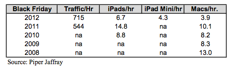 In a story that was originally posted by Fortune, “Munster’s crew spent eight hours on Black Friday, as it has every year for the past five years, counting heads at the Apple Store in the Mall of America in Minneapolis. This year he (or his staff) also spent two hours monitoring the Microsoft Store directly across the hall.” In a quick-and-dirty version of the study’s results, the following table was also released with regard to Apple: