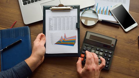 A finance executive with a satisfied smile reviewing a pile of documents in their office.