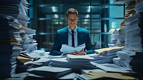 A portfolio manager with a stack of financial documents, illustrating the asset management industry.