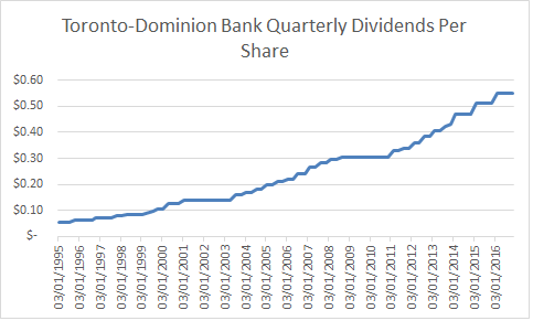 Toronto-Dominion Bank (NYSE:TD) provides financial and banking services in North America and internationally. The company also has significant operations in the US. Toronto-Dominion Bank (NYSE:TD) has paid dividends since 1857. Over the past decade, Toronto-Dominion Bank (NYSE:TD) has increased its quarterly dividends per share at a rate of 8.60%/year, even though the annual dividend was left unchanged in 2010. Earnings per share have increased by 4%/year over the same period. The bank sells for 14.10 times earnings and yields 3.30%.