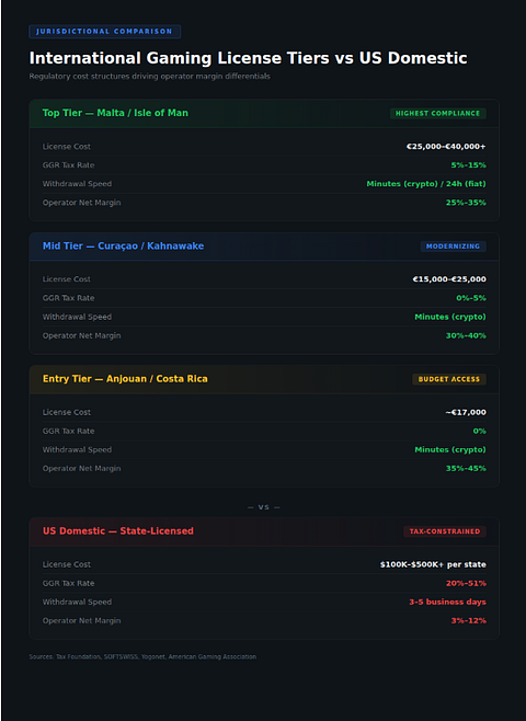 An internationally licensed operator faces: a flat licensing fee (often annual), corporate tax in its domicile jurisdiction (frequently 0–15%), and compliance costs proportional to its licensing tier. Net margins routinely exceed 30%.