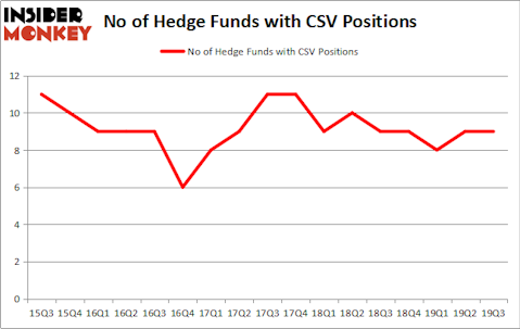 At the end of the third quarter, a total of 9 of the hedge funds tracked by Insider Monkey held long positions in this stock, a change of 0% from the previous quarter. By comparison, 9 hedge funds held shares or bullish call options in CSV a year ago. With hedge funds’ capital changing hands, there exists a select group of notable hedge fund managers who were upping their stakes considerably (or already accumulated large positions).