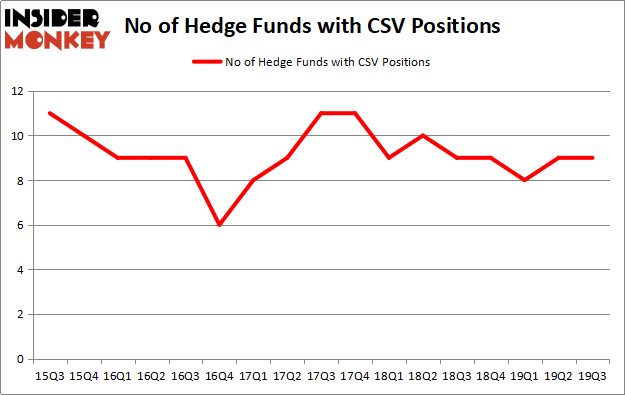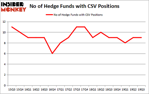 At the end of the third quarter, a total of 9 of the hedge funds tracked by Insider Monkey held long positions in this stock, a change of 0% from the previous quarter. By comparison, 9 hedge funds held shares or bullish call options in CSV a year ago. With hedge funds’ capital changing hands, there exists a select group of notable hedge fund managers who were upping their stakes considerably (or already accumulated large positions).