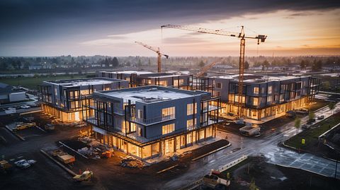 Aerial view of a commercial real estate development in progress, showcasing the company’s mastery of the sector.