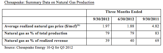 The company’s average realized price for natural gas fell to $1.97 per million cubic feet in Q3 2012 compared to $4.82 in the same period of 2011, although this was a modest improvement on Q2 2012. Natural gas production as a percent of realized revenue fell from 69% to 39% over the same period, yet natural gas as a percent of total production fell only modestly from 83% to 79%.