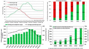 The revenue from liquids has grown dramatically, accounting for 59% of the company’s total realized revenue in 2012, whereas total liquids production represented 21% of the total production.