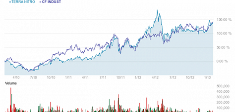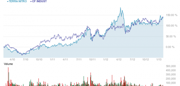 So which is the better choice between the two? One important factor makes Terra Nitrogen the winner in my book. Terra Nitrogen is still expanding its own operations as evidenced by the 13% capital re-investment rate. Compare that to the industry average of only 8%. Making this company both a growth story and a solid dividend payer. Looking at a 3 year chart of both companies (Figure 2) we can see little divergence between the two.
