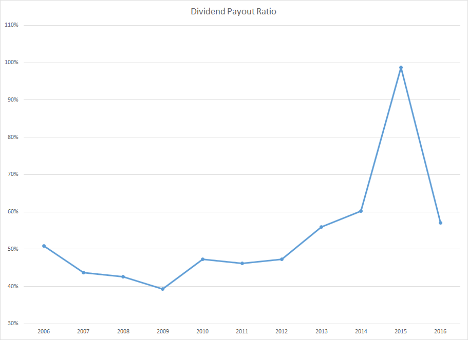 The dividend payout ratio increased from 43.40% in 2007 to almost 57% in 2016. A lower payout is always a plus, since it leaves room for consistent dividend growth, minimizing the impact of short-term fluctuations in earnings.