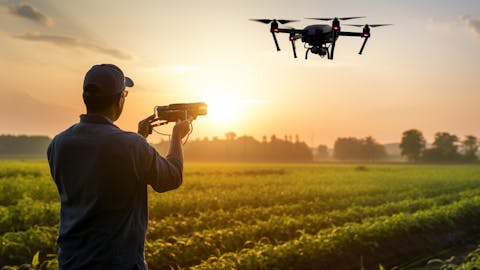 A rustic farm field with a tractor spreadng nitrogen-based fertilizer in the background.