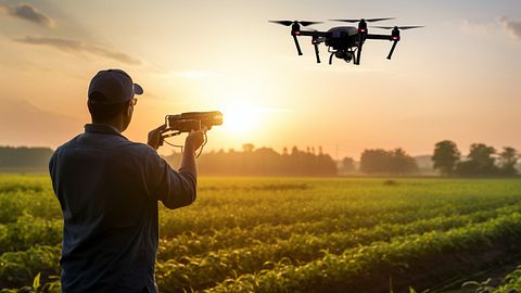A rustic farm field with a tractor spreadng nitrogen-based fertilizer in the background.