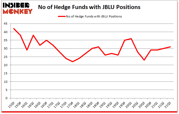 JetBlue Airways Corporation (NASDAQ:JBLU) was in 31 hedge funds’ portfolios at the end of September. The all time high for this statistic is 42. JBLU has seen an increase in hedge fund sentiment lately. There were 30 hedge funds in our database with JBLU positions at the end of the second quarter. Our calculations also showed that JBLU isn’t among the 30 most popular stocks among hedge funds (click for Q3 rankings).