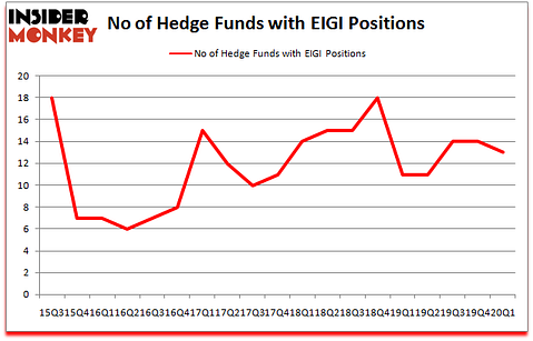 At the end of the first quarter, a total of 13 of the hedge funds tracked by Insider Monkey were bullish on this stock, a change of -7% from the previous quarter. Below, you can check out the change in hedge fund sentiment towards EIGI over the last 18 quarters. So, let’s check out which hedge funds were among the top holders of the stock and which hedge funds were making big moves.