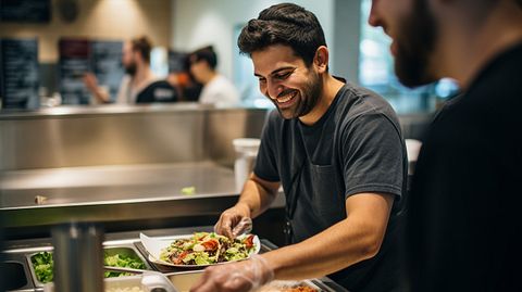 An employee serving a customer at a dine-in Fast Casual Restaurant.