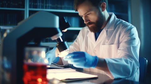 A scientist in a laboratory working on a gene editing tool, to create treatments for rare genetic diseases.