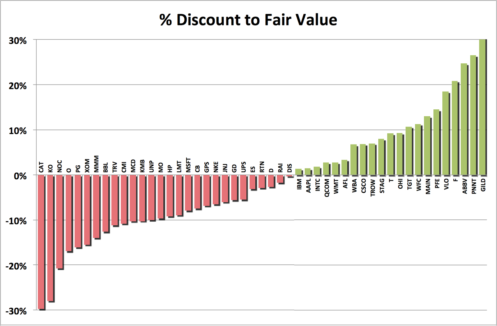 The following chart shows the percentage discount to fair value of all the stocks in my portfolio. Green bars represent discounts, and red bars represent premiums (or negative discounts):
