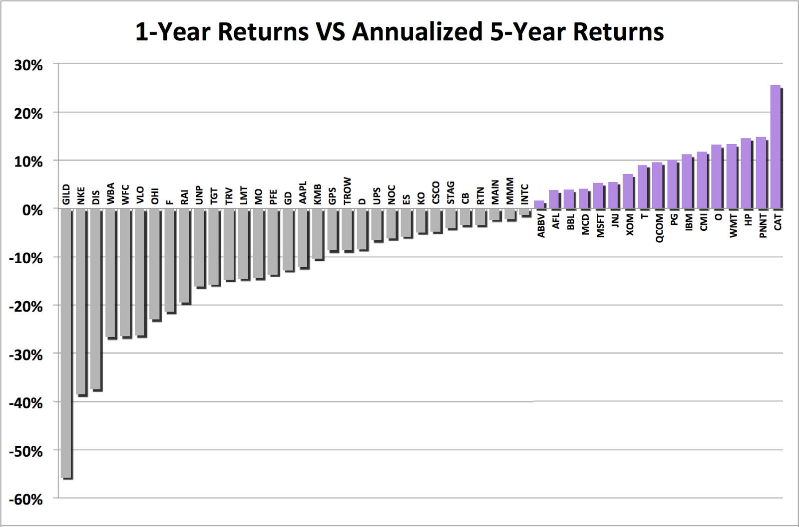 The chart confirms that GILD has been the worst performer over the past year, this time compared with its annualized performance over five years. In contrast, CAT is performing quite well relative to its annualized 5-year performance.