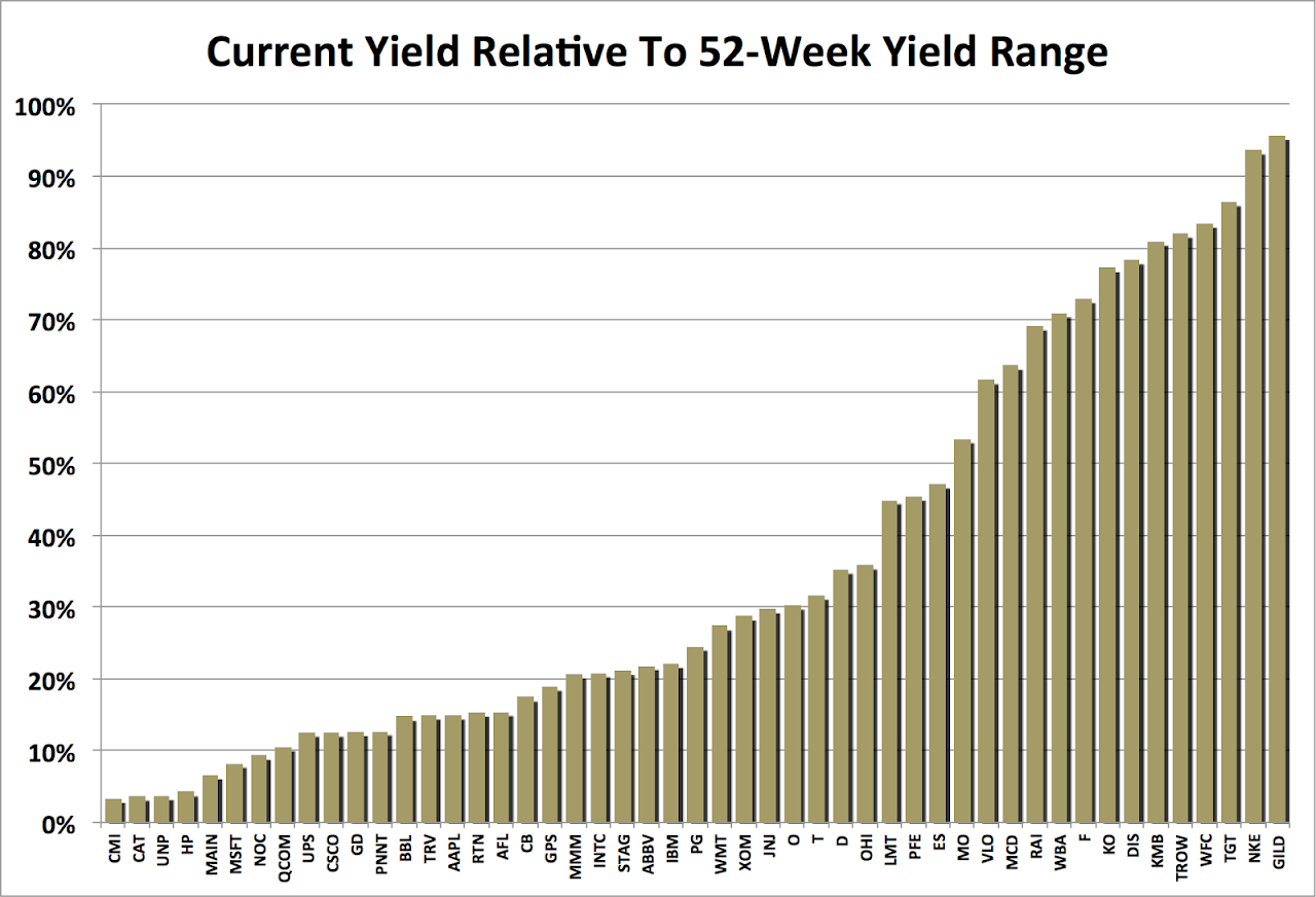Another way to look at a stock’s recent performance is to plot current yield relative to the 52-week yield range. For consistent dividend payments, a stock’s yield rises when the stock price drops, and vice versa. Dividend growth investors often look at current yield relative to average yield over a time frame. A higher current yield suggests that a stock may be undervalued.