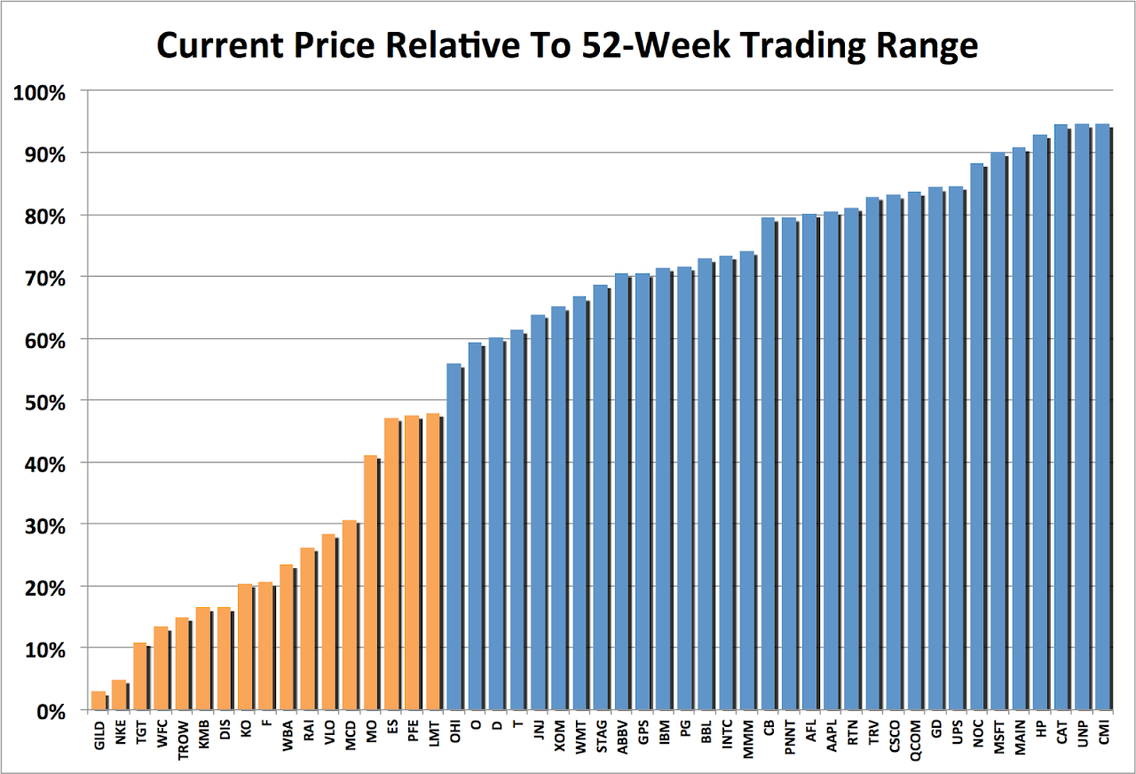One way to assess a stock’s recent performance is to plot the current price relative to its 52-week trading range: