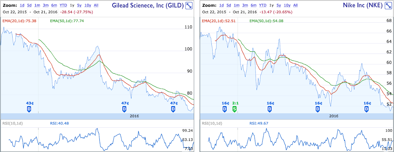 Stocks trading below the 50% mark are potentially are undervalued. The chart hides the magnitude of the trading range, but a quick check confirms that both GILD and NKE performed rather poorly over the past 52 weeks. GILD is down 28% and NKE is down 21%: