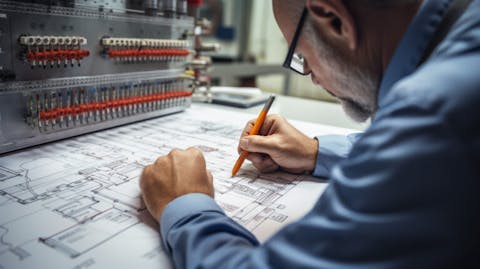 An engineer with a pen and paper designing a switchgear circuit diagram.