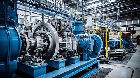 A group of industrial workers in coveralls operating a large scale pump system in a factory.