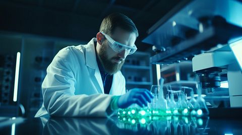 Front view of a scientist working in a laboratory, conducting research on a biopharmaceutical product.