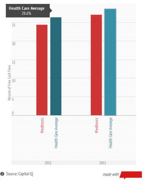 A quick-and-dirty technique for checking a dividend’s sustainability is taking a look at something called the payout ratio. Typically this is expressed as a percentage, looking at a company’s dividend per share relative to its net income per share. That’s a decent start, but I prefer to use a slightly different measurement that replaces net income, an accounting measurement, with something more tangible — cold hard cash. The chart below shows how much of Medtronic, Inc. (NYSE:MDT)’s free cash flow has been eaten up by its dividend payments over the past two years. The lower the better, suggesting more capacity for future dividend hikes.