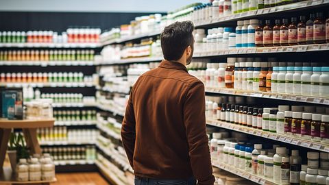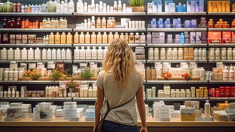 A shopper browsing through a discount retailers merchandise aisle filled with a wide variety of items.