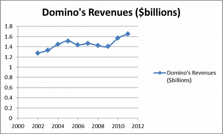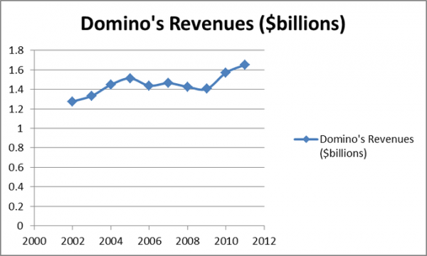 Domino's Pizza, Inc. (NYSE:DPZ)Domino’s delivers more pizzas than anyone else and has a 23% market share, with over 5,000 stores domestically in addition to over 4,800 internationally.  Domino’s has grown its revenues nicely in recent years, mainly due to highly increased marketing efforts and drastic changes to their pizza formula (it really is that much better).  In fact, after the new pizza recipes were introduced, same-store sales increased by 9.9% in 2010 alone, a huge increase for any established retail business.